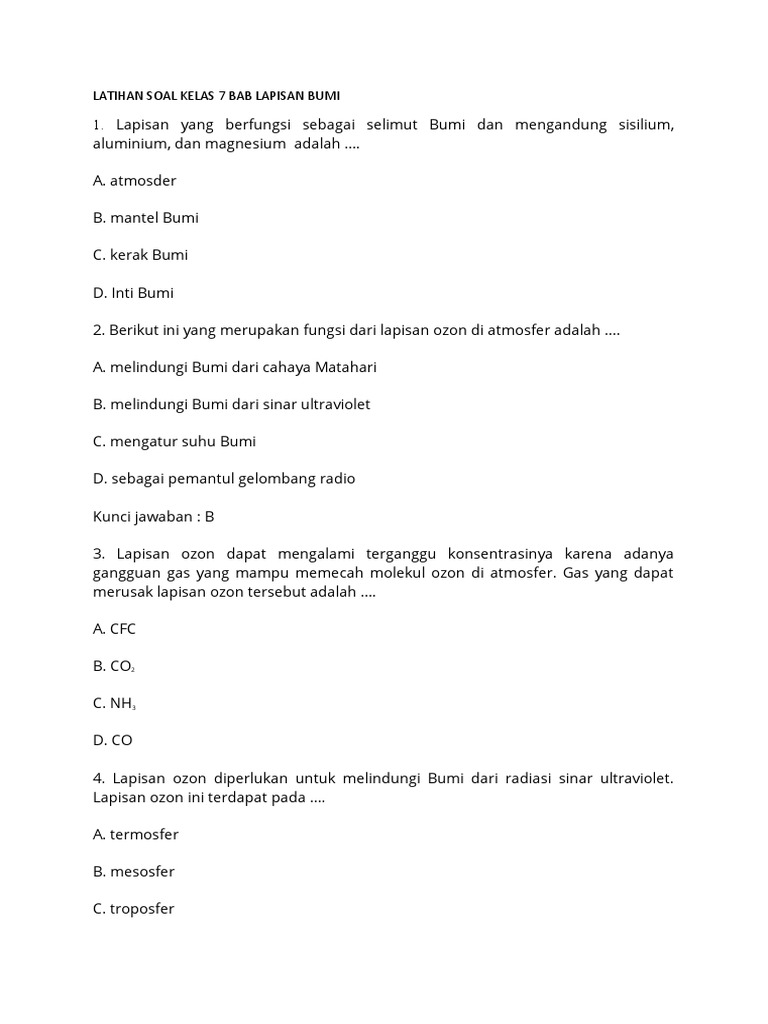 Lapisan bumi merupakan struktur kompleks yang terdiri dari beberapa lapisan berbeda dengan karakteristik uniknya masing-masing. Pemahaman tentang lapisan bumi sangat penting karena memengaruhi berbagai aspek kehidupan di planet ini, mulai dari aktivitas vulkanik dan gempa bumi hingga iklim dan cuaca. Artikel ini akan menyajikan contoh soal yang relevan dengan materi lapisan bumi untuk siswa kelas 7 semester 2, lengkap dengan pembahasan mendalam untuk membantu memperkuat pemahaman konsep.